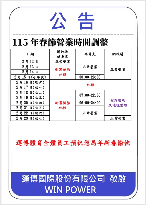 2026-02-06 青年公園運動休閒園區 in 最新消息 6810 115年春節開放時間調整 預祝大家馬年行大運 相關文章 第一階段泳池大樓建物耐震補強工程 114年預收款信託證明書 113-114年公共意外責任險